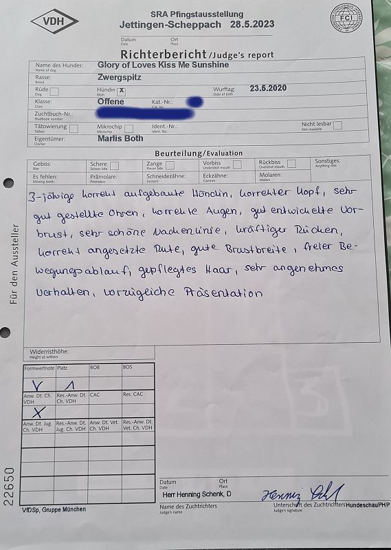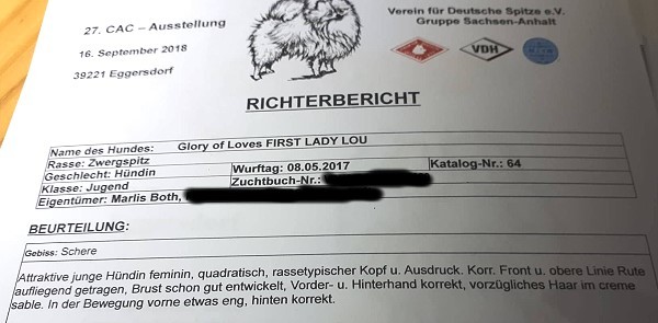2023 besuchten wir mit Sunni (Glory of Loves Kiss Me Sunshine) eine Ausstellung. Wer mich kennt, weiß, dass ich selten auf Ausstellungen zu finden bin. Da es aber sein könnte, dass es nun leider die letzte Ausstellung in Erfurt ist, hatte ich Sunni noch mal gemeldet. Umso größer war die Überraschung über die tolle Bewertung des spanischen Richters Herr Lladosa, über die ich mich natürlich ganz besonders gefreut habe, zumal Sunni ja meine eigene Nachzuchthündin ist.